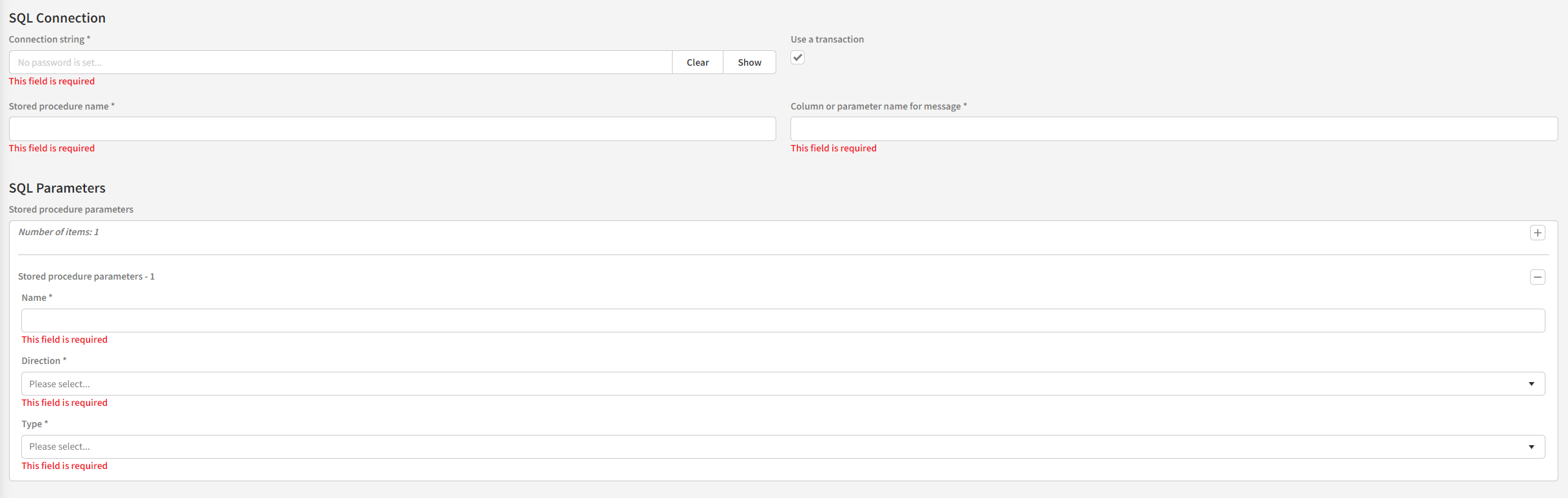 The parameters for the stored procedure must be clearly defined and mapped correctly. The column or parameter name specifies where the message content will be extracted from—whether as a column in the result set or a parameter within the stored procedure. If a column is specified, multiple messages can be polled and processed in one operation, with each row representing an individual message. If the column or parameter name starts with a @ it is assumed to be a parameter name, otherwise it is treated as a column name.