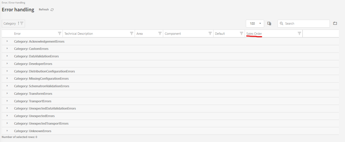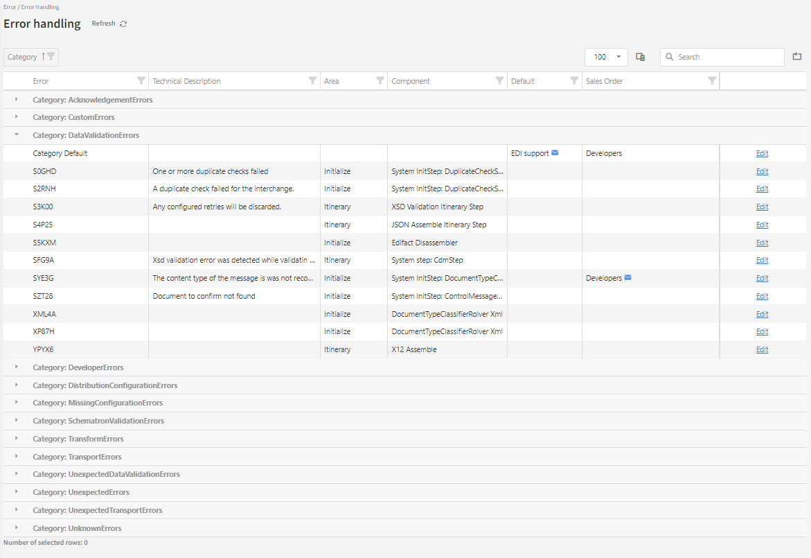 In this example, the stakeholder “EDI support” has been assigned to all errors (they are assigned as Default) with the error code category “DataValidationErrors” - except for the error code SYE3G which for Sales orders will be handled by the “Developers” stakeholder.