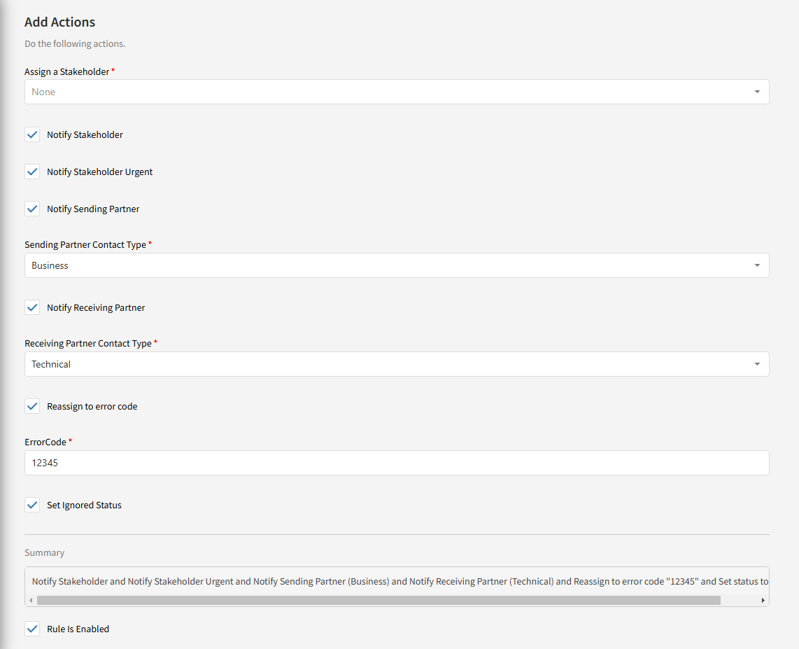 Remember that the default rule is used for every failed document that is not specifically matched to another rule, so you should avoid giving it actions you do not wish to be run for all types of document. For instance, it is probably not a good idea to notify the sending or receiving partners on the default rule, as that is generally something you need to clear with a partner in advance.