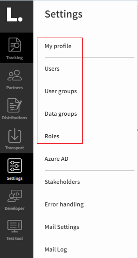 Hovering your mouse over the 'Settings' item on the left-hand menu will display a list of options related to user management. Depending on your permissions, some options may not be available. If you double-click the 'Settings' item, you will be directed to the 'My Profile' page by default.